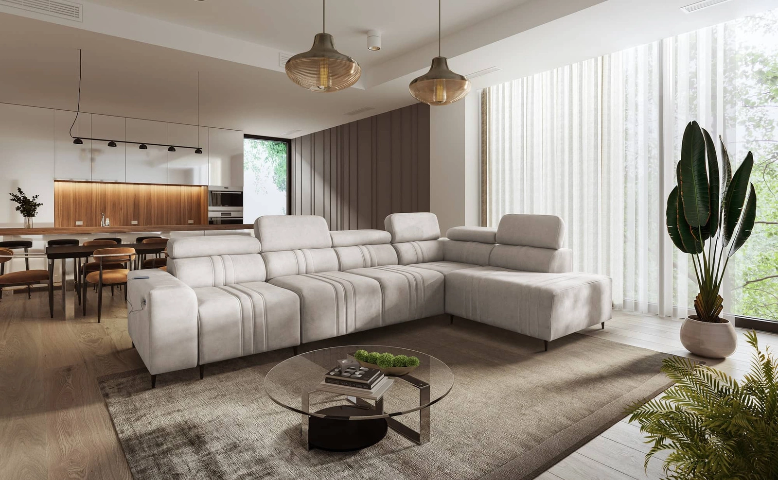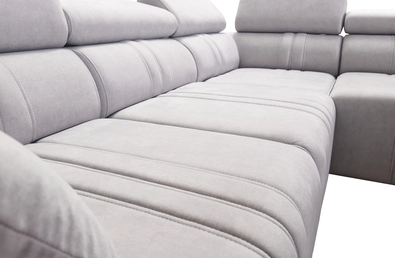 Narożnik Castel XI w kolorze beżowym z regulowanymi zagłówkami to niezwykle elegancki mebel o ciekawym wykończeniu.