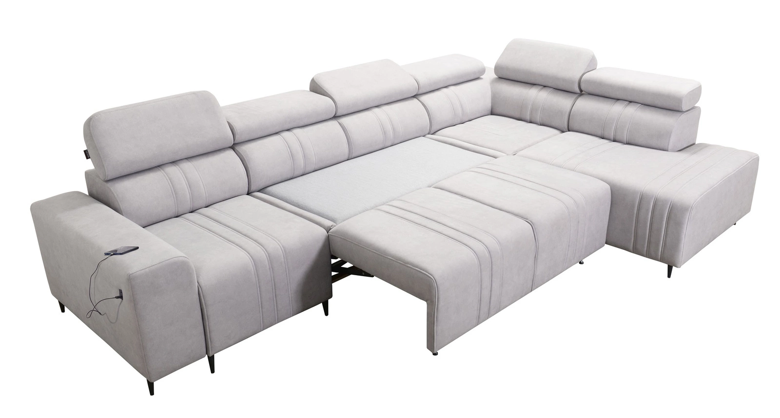Dodatki tego mebla, które docenią wszyscy użytkownicy to pojemnik na pościel, regulowane zagłówki oraz gniazdo ładowania USB w boczku narożnika.