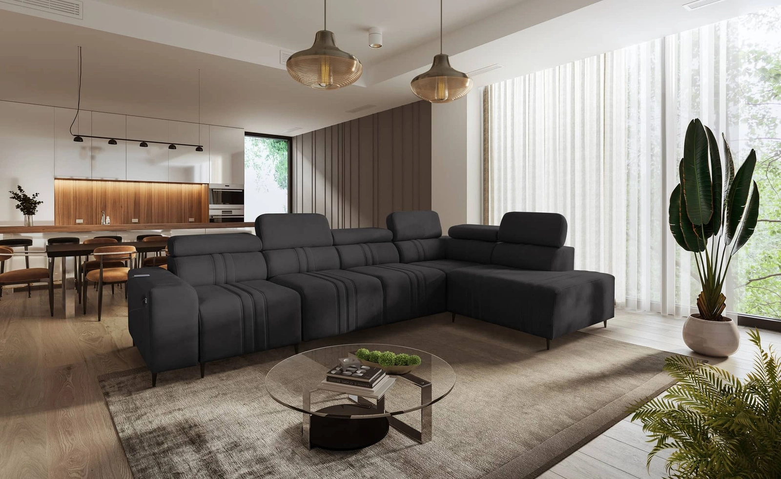 Narożnik Castel XI w kolorze grafitowym z regulowanymi zagłówkami to niezwykle elegancki mebel o ciekawym wykończeniu.