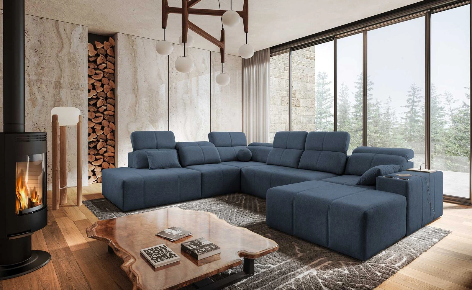 Narożnik z funkcją spania Tesalia X niebieski prawostronny nowoczesny i komfortowy narożnik z innowacyjną funkcją przesuwanego oparcia