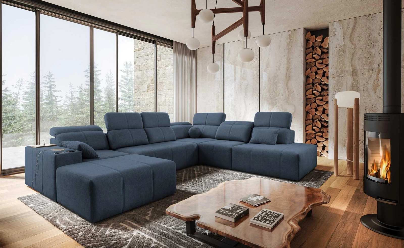 Narożnik z funkcją spania Tesalia X niebieski lewostronny nowoczesny i komfortowy narożnik z innowacyjną funkcją przesuwanego oparcia