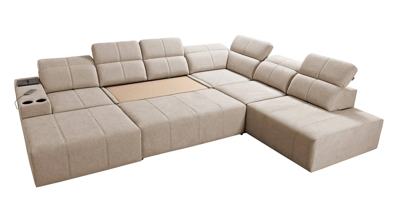 Dodatki tego mebla, które docenią wszyscy użytkownicy to gniazdo ładowania USB, uchwyty na kubki, regulowane oparcia pozwalające dopasować głębokość siedziska oraz pojemniki na pościel.