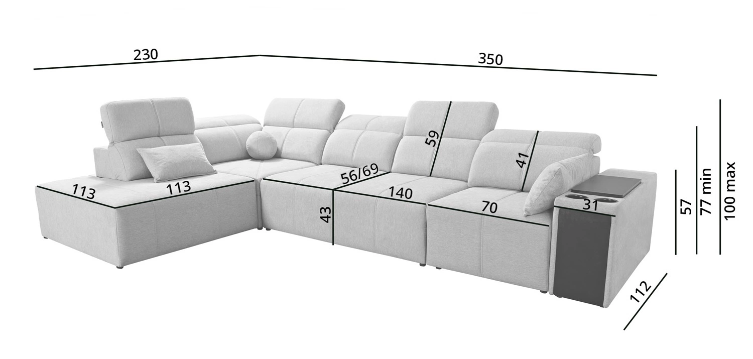 Wymiary mebla pozwolą na zapełnienie przestrzeni w przestronnym salonie lub pokoju dziennym. Szerokość narożnika 350 cm, wysokość maksymalna 100 cm oraz głębokość 230 cm. Powierzchnia spania narożnika wynosi 138x212 cm. Wysokość siedziska mebla to 43 cm a maksymalna wysokość oparcia wynosi 59 cm. Sprężyny faliste oraz pianka poliuretanowa T30 to materiał, z którego wykonane zostało siedzisko narożnika. Oparcie z regulowanymi zagłówkami pozwoli na łatwe dostosowanie kąta nachylenia zagłówków do swoich preferencji oraz daje gwarancję wygodnego wypoczynku po długim dniu, które docenisz Ty, Twoi bliscy a także goście, którzy zasiądą na tym wyjątkowym narożniku.