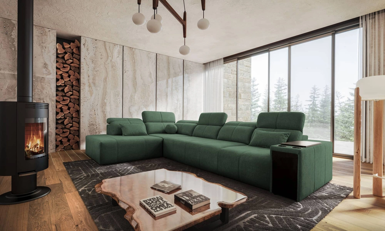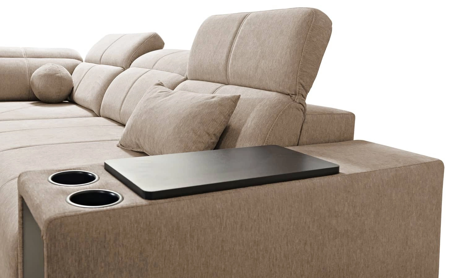 Dodatki tego mebla, które docenią wszyscy użytkownicy to regulowane oparcia pozwalające dopasować głębokość siedziska, szuflada i otwierany barek w boczku narożnika, gniazdo ładowania USB, uchwyty na kubki oraz pojemniki na pościel.