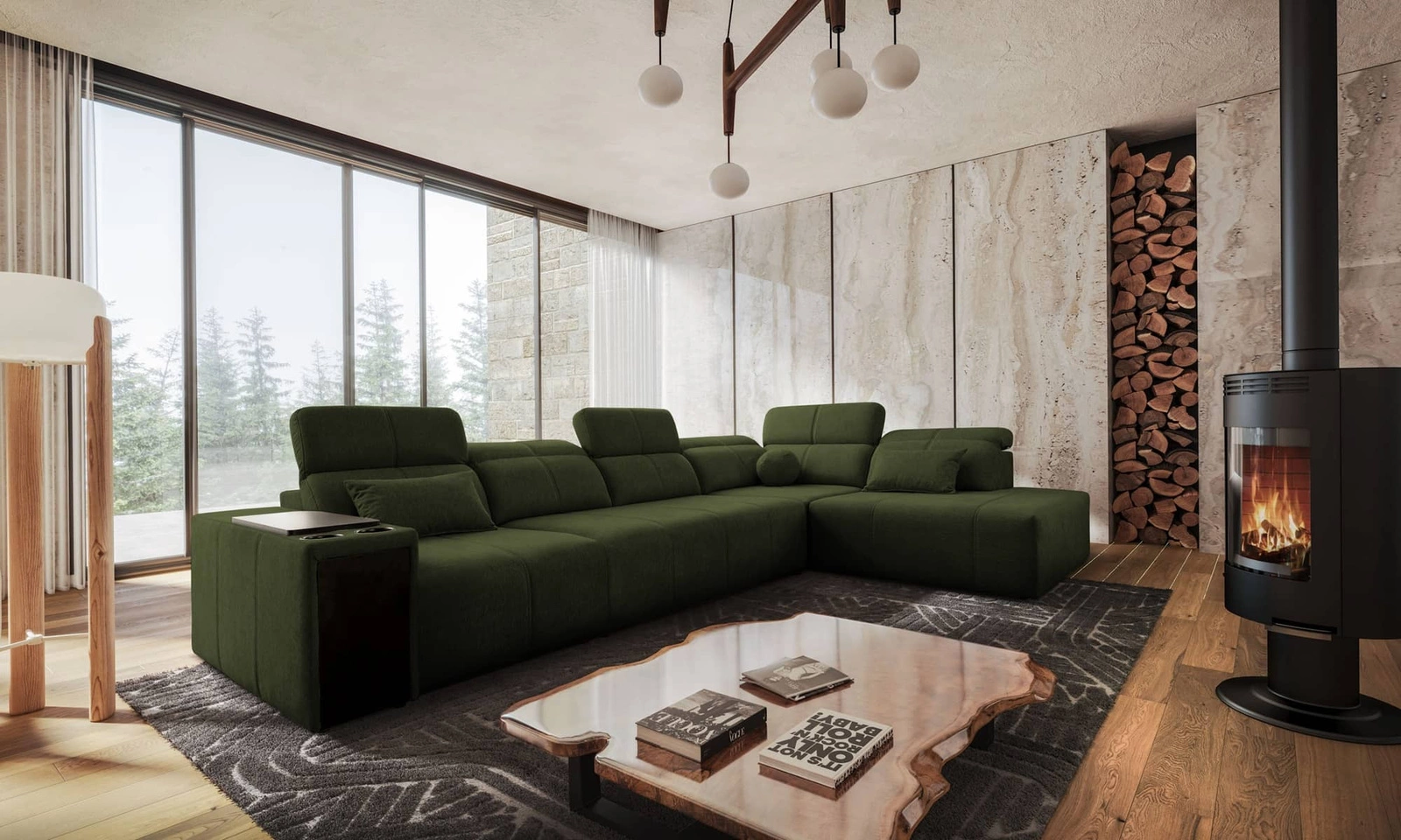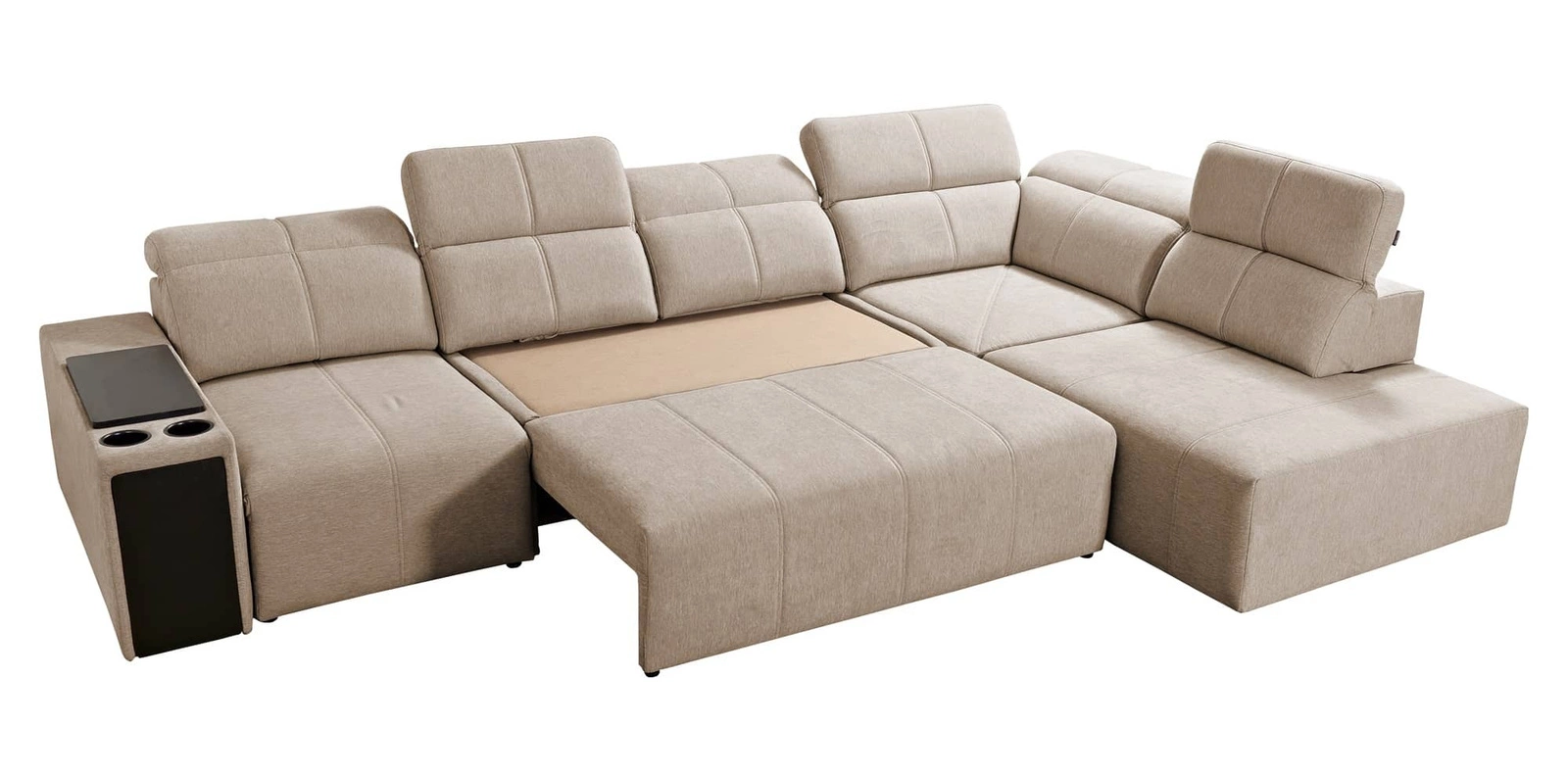 Dodatki tego mebla, które docenią wszyscy użytkownicy to regulowane oparcia pozwalające dopasować głębokość siedziska, szuflada i otwierany barek w boczku narożnika, gniazdo ładowania USB, uchwyty na kubki oraz pojemniki na pościel.