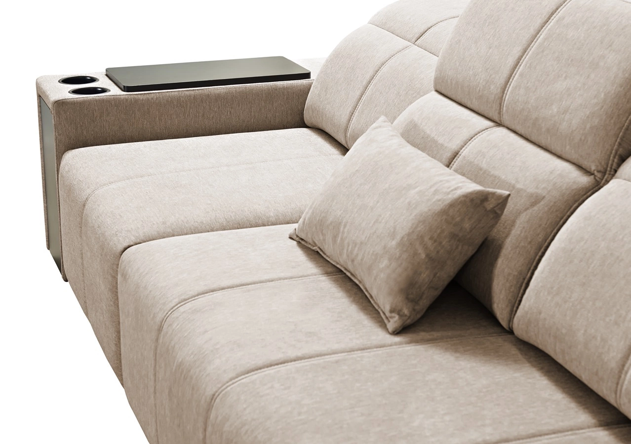 Dodatki tego mebla, które docenią wszyscy użytkownicy to regulowane oparcia pozwalające dopasować głębokość siedziska, szuflada i otwierany barek w boczku narożnika, gniazdo ładowania USB, uchwyty na kubki oraz pojemniki na pościel.