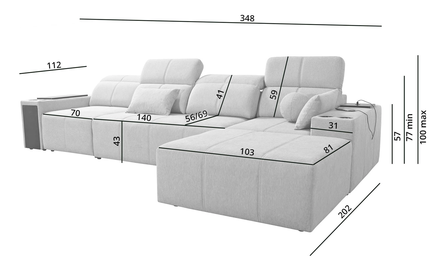 Wymiary mebla pozwolą na zapełnienie przestrzeni w przestronnym salonie lub pokoju dziennym. Szerokość narożnika 348 cm, wysokość maksymalna 100 cm oraz głębokość 202 cm. Powierzchnia spania narożnika wynosi 138x212 cm. Wysokość siedziska mebla to 43 cm a maksymalna wysokość oparcia wynosi 59 cm. Sprężyny faliste oraz pianka poliuretanowa T30 to materiał, z którego wykonane zostało siedzisko narożnika. Oparcie z regulowanymi zagłówkami pozwoli na łatwe dostosowanie kąta nachylenia zagłówków do swoich preferencji oraz daje gwarancję wygodnego wypoczynku po długim dniu, które docenisz Ty, Twoi bliscy a także goście, którzy zasiądą na tym wyjątkowym narożniku.