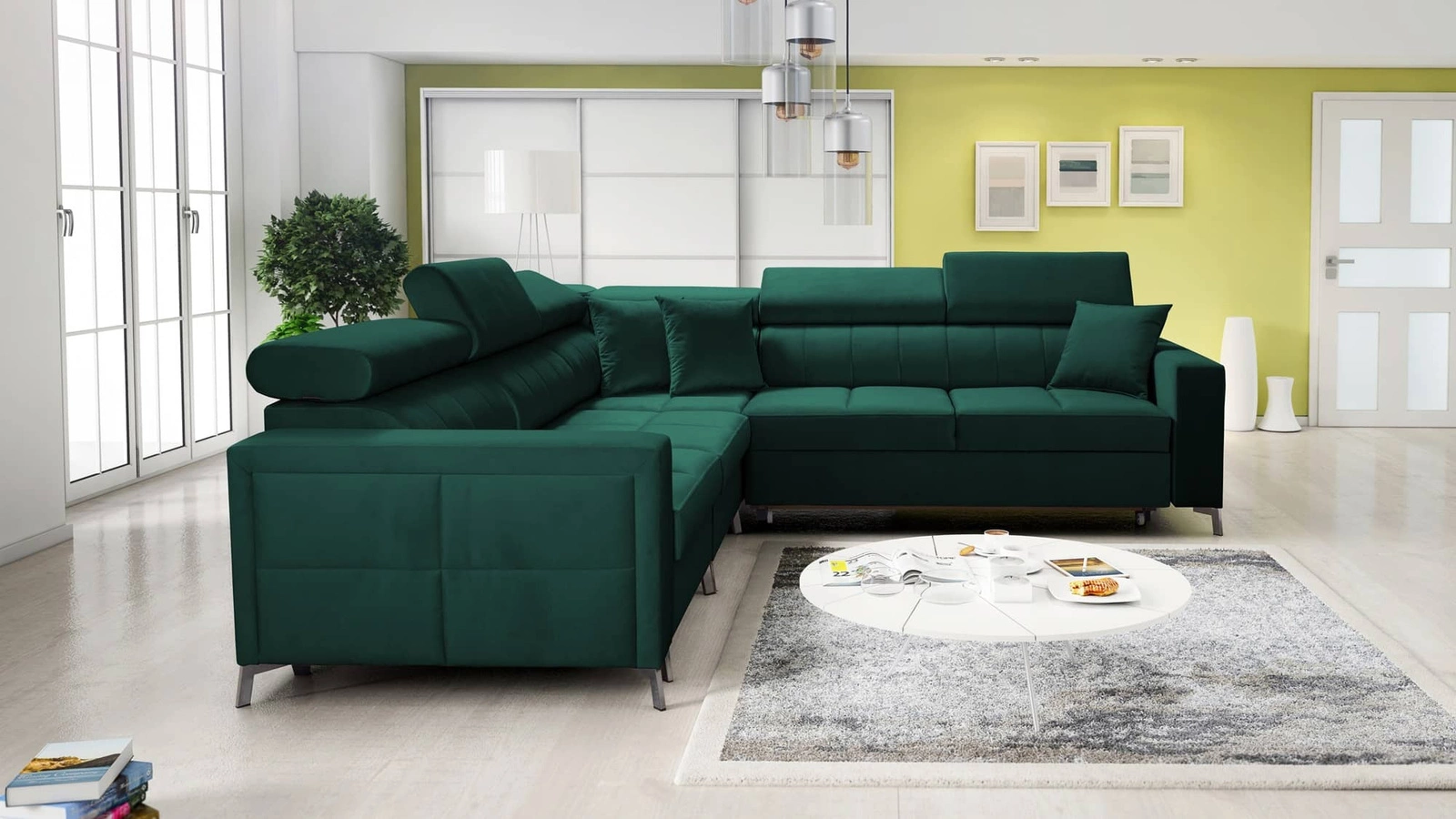 Narożnik Nausa IV w kolorze butelkowa zieleń z regulowanymi zagłówkami to elegancki mebel, który dopasuje sie do każdej aranżacji.