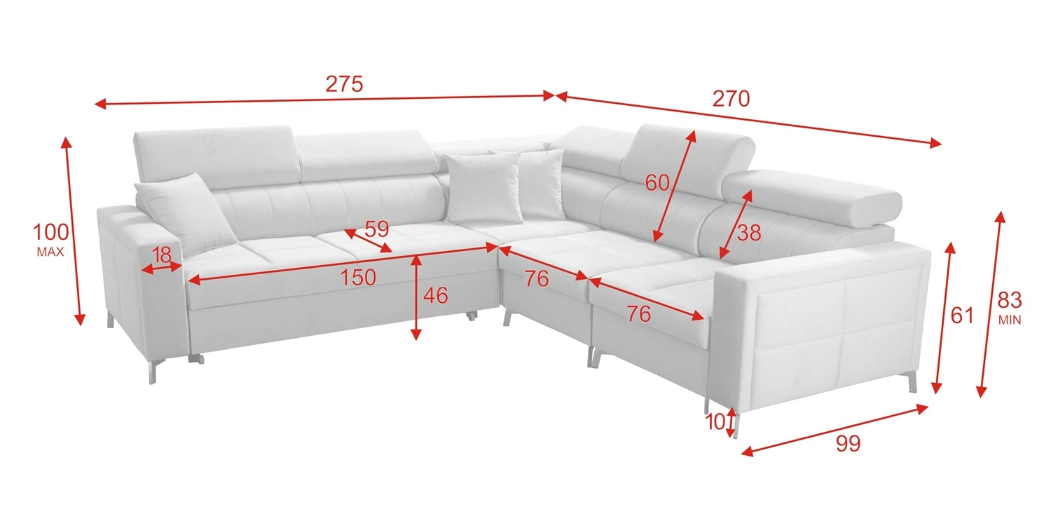 Wymiary mebla pozwolą na zapełnienie przestrzeni w przestronnym salonie lub pokoju dziennym. Szerokość narożnika 275 cm, wysokość maksymalna 100 cm oraz głębokość 270 cm. Powierzchnia spania narożnika wynosi 127x210 cm. Wysokość siedziska mebla to 46 cm a maksymalna wysokość oparcia wynosi 60 cm. Sprężyny faliste oraz pianka poliuretanowa T30 to materiał, z którego wykonane zostało siedzisko narożnika. Oparcie stałe z regulowanymi zagłówkami pozwoli na łatwe dostosowanie kąta nachylenia zagłówków do swoich preferencji oraz daje gwarancję wygodnego wypoczynku po długim dniu, które docenisz Ty, Twoi bliscy a także goście, którzy zasiądą na tym wyjątkowym narożniku.