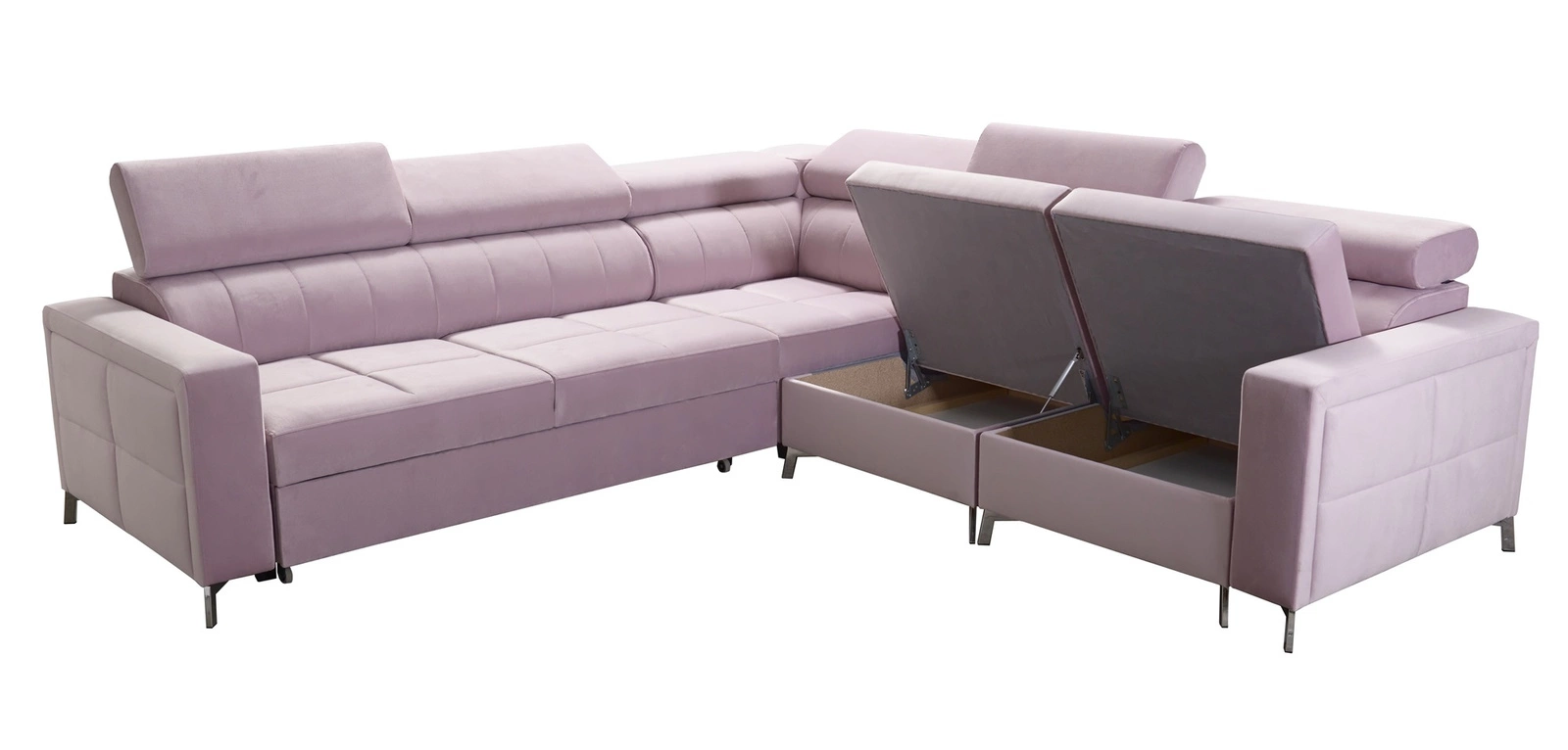 Narożnik z funkcją spania Nausa IV szary prawostronny velvet dekoracyjne przeszycia na siedzisku narożnik z pojemnikami na pościel