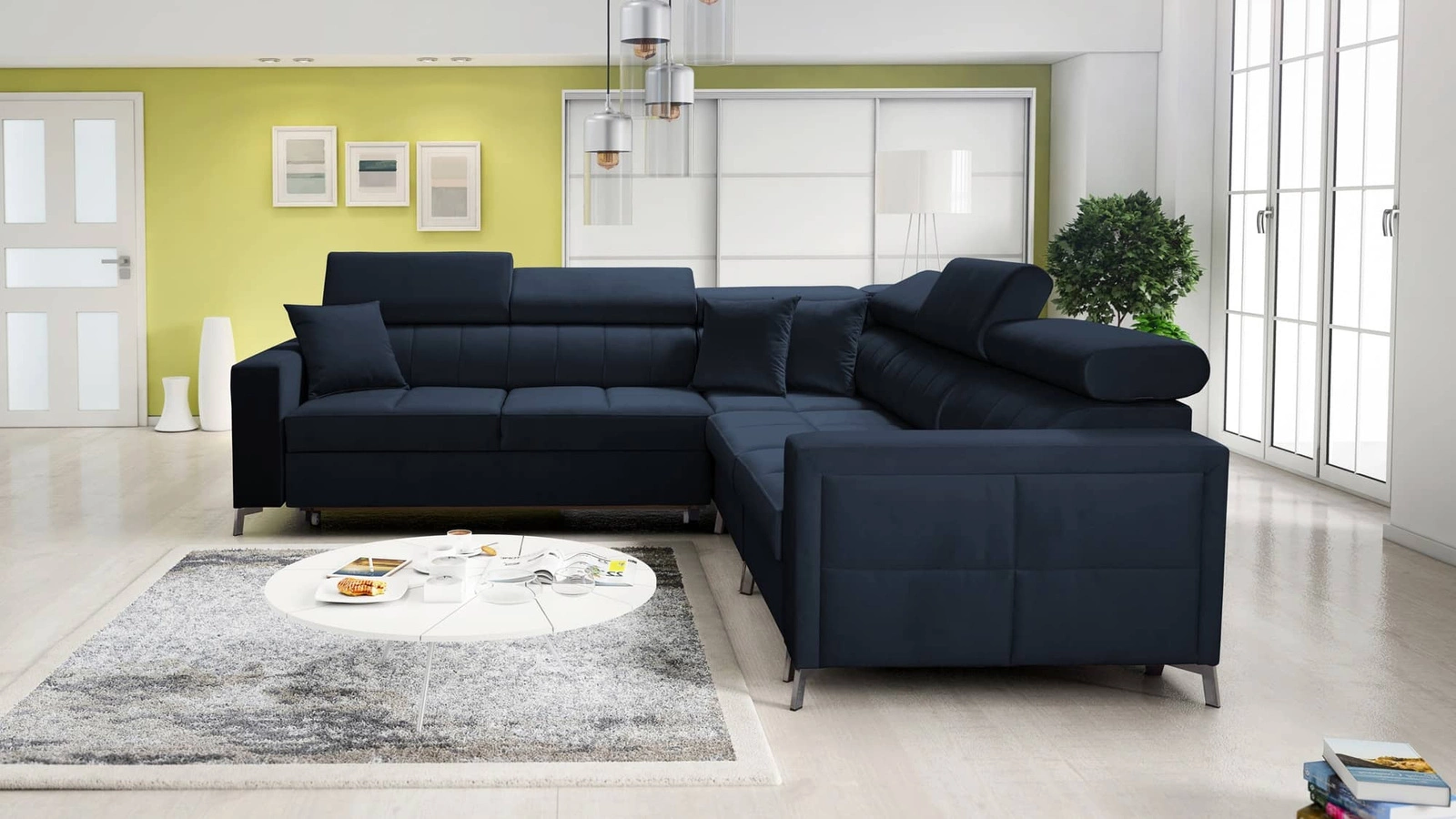 Narożnik Nausa IV w kolorze granatowym z regulowanymi zagłówkami to elegancki mebel, który dopasuje sie do każdej aranżacji.
