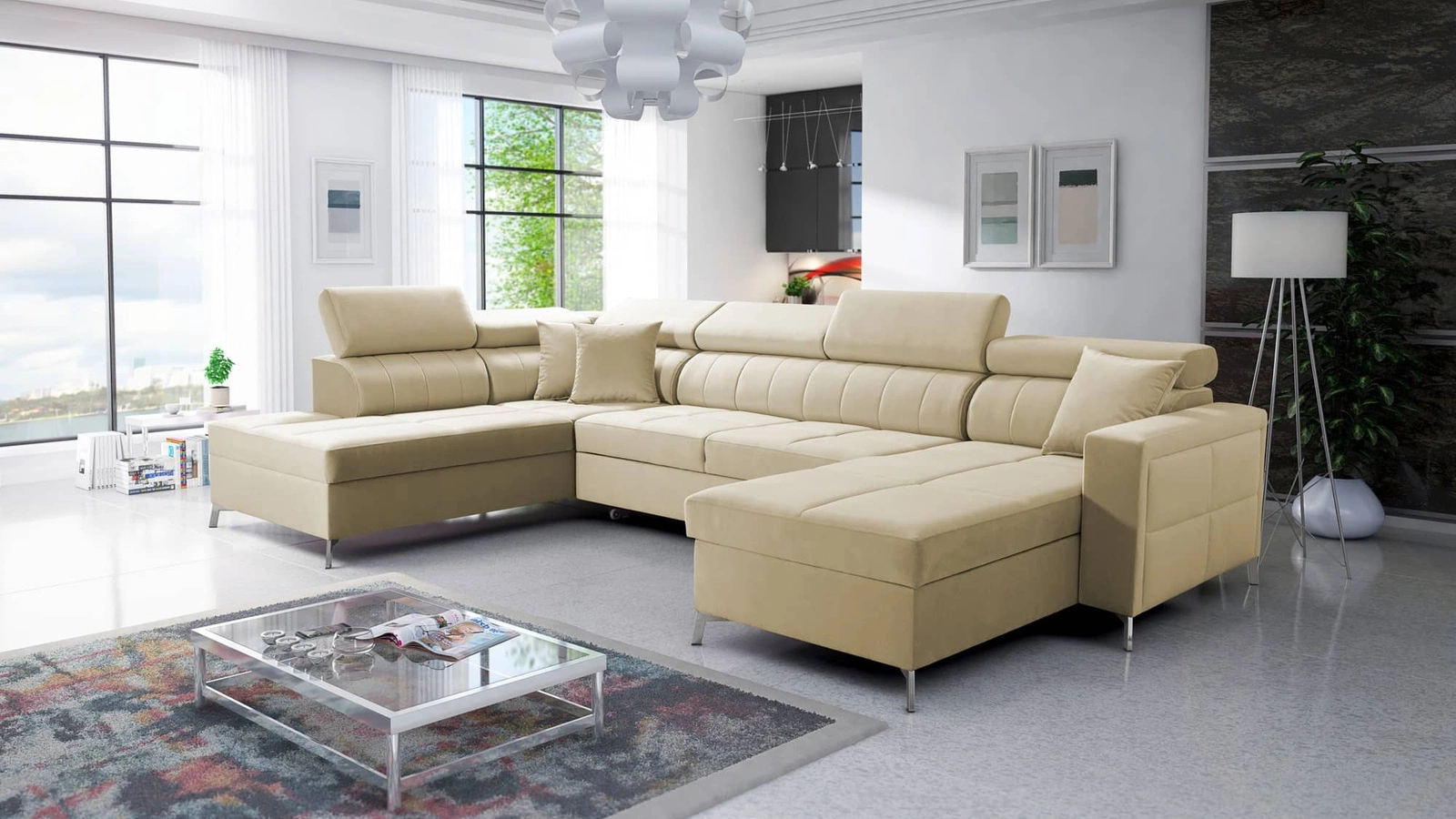 Narożnik Nausa VI w kolorze beżowym z regulowanymi zagłówkami to elegancki mebel, który dopasuje się do każdej aranżacji.