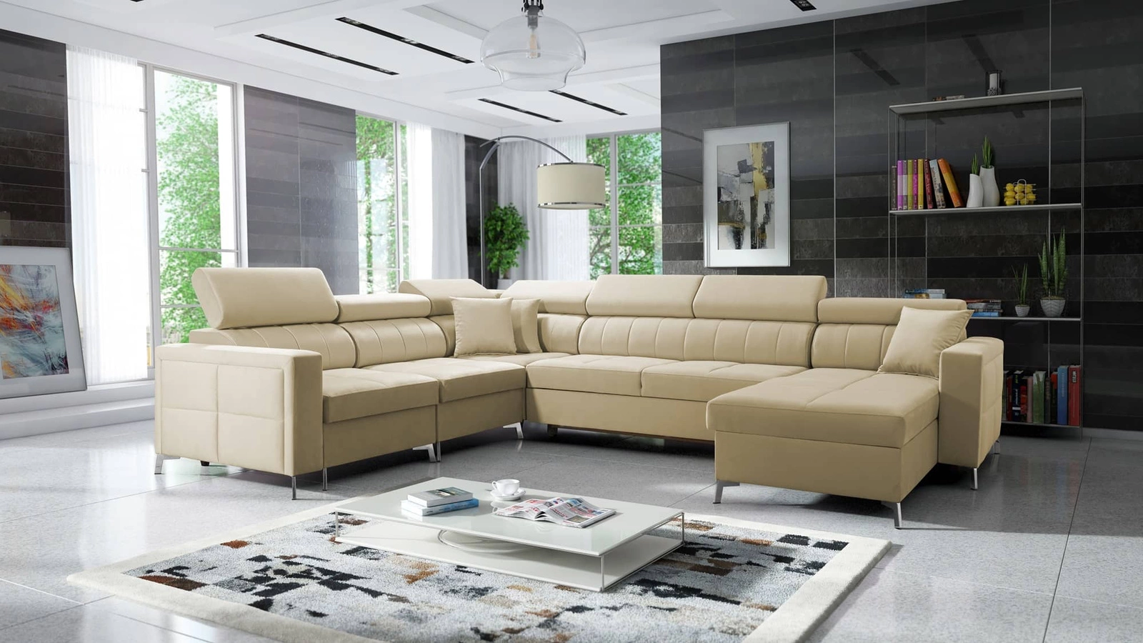 Narożnik Nausa VII w kolorze beżowym z regulowanymi zagłówkami to elegancki mebel, który dopasuje się do każdej aranżacji.