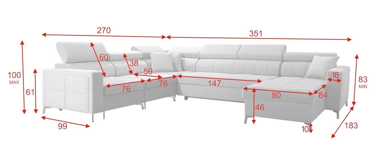Wymiary mebla pozwolą na zapełnienie przestrzeni w przestronnym salonie lub pokoju dziennym. Szerokość narożnika 351 cm, wysokość maksymalna 100 cm oraz głębokość 270 cm. Powierzchnia spania narożnika wynosi 127x286 cm. Wysokość siedziska mebla to 46 cm a maksymalna wysokość oparcia wynosi 60 cm. Sprężyny faliste oraz pianka poliuretanowa T30 to materiał, z którego wykonane zostało siedzisko narożnika. Oparcie stałe z regulowanymi zagłówkami pozwoli na łatwe dostosowanie kąta nachylenia zagłówków do swoich preferencji oraz daje gwarancję wygodnego wypoczynku po długim dniu, które docenisz Ty, Twoi bliscy a także goście, którzy zasiądą na tym wyjątkowym narożniku.