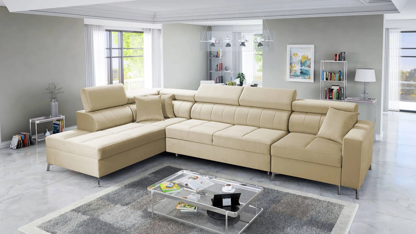 Narożnik Nausa X w kolorze beżowym z regulowanymi zagłówkami to elegancki mebel, który dopasuje się do każdej aranżacji.