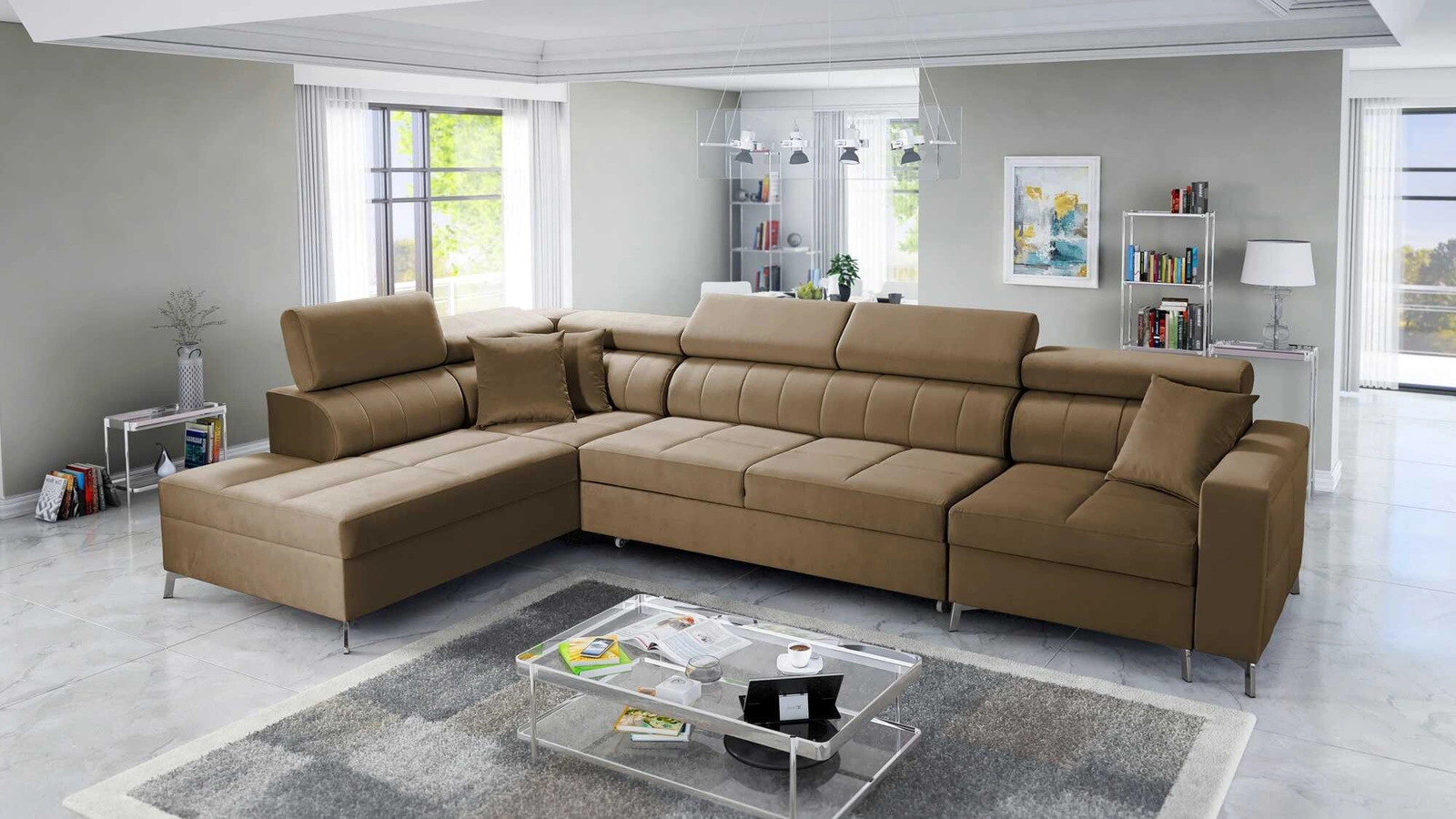 Narożnik Nausa X w kolorze jasny brąz z regulowanymi zagłówkami to elegancki mebel, który dopasuje się do każdej aranżacji.