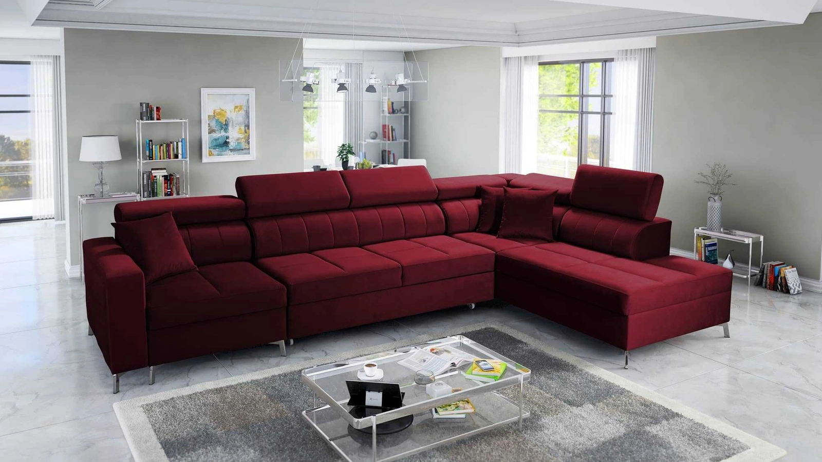 Narożnik Nausa X w kolorze bordowym z regulowanymi zagłówkami to elegancki mebel, który dopasuje się do każdej aranżacji.