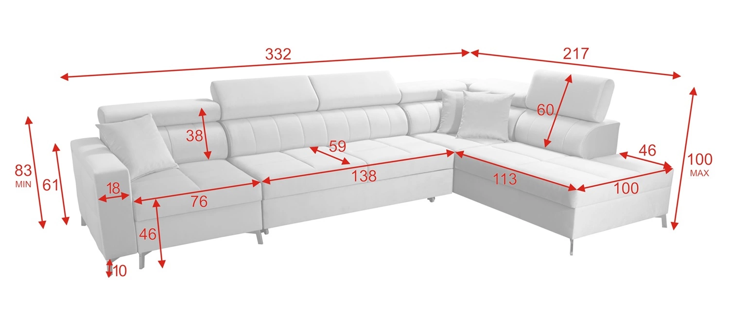 Wymiary mebla pozwolą na zapełnienie przestrzeni w przestronnym salonie lub pokoju dziennym. Szerokość narożnika 332 cm, wysokość maksymalna 100 cm oraz głębokość 217 cm. Powierzchnia spania narożnika wynosi 127x200 cm. Wysokość siedziska mebla to 46 cm a maksymalna wysokość oparcia wynosi 60 cm. Sprężyny faliste oraz pianka poliuretanowa T30 to materiał, z którego wykonane zostało siedzisko narożnika. Oparcie stałe z regulowanymi zagłówkami pozwoli na łatwe dostosowanie kąta nachylenia zagłówków do swoich preferencji oraz daje gwarancję wygodnego wypoczynku po długim dniu, które docenisz Ty, Twoi bliscy a także goście, którzy zasiądą na tym wyjątkowym narożniku.
