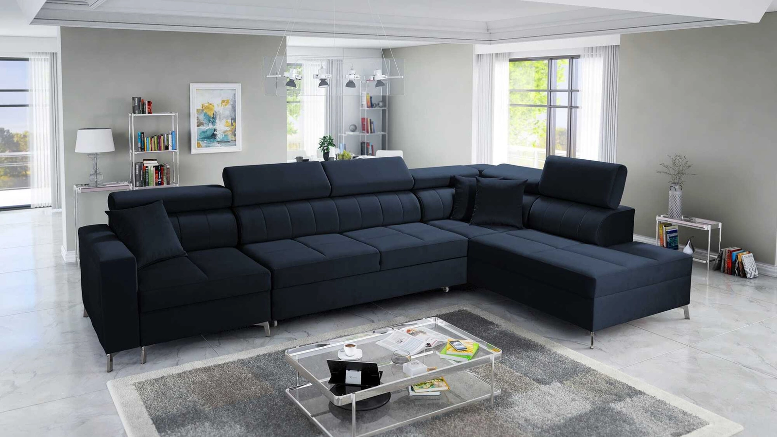 Narożnik Nausa X w kolorze granatowym z regulowanymi zagłówkami to elegancki mebel, który dopasuje się do każdej aranżacji.