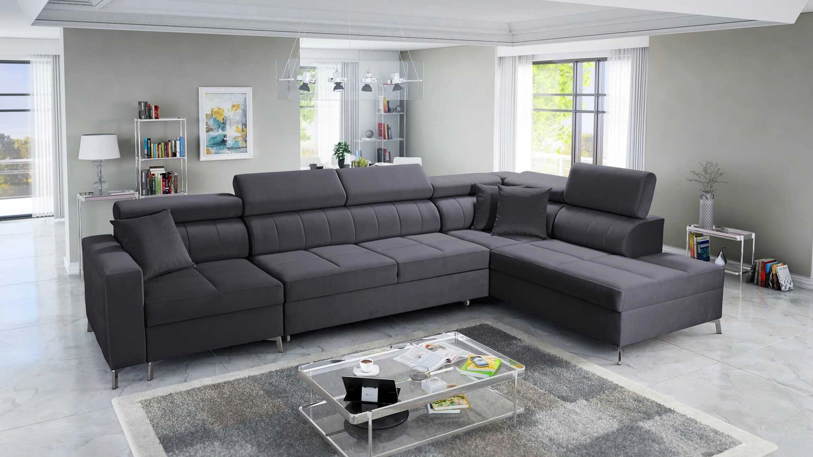 Narożnik Nausa X w kolorze grafitowym z regulowanymi zagłówkami to elegancki mebel, który dopasuje się do każdej aranżacji.