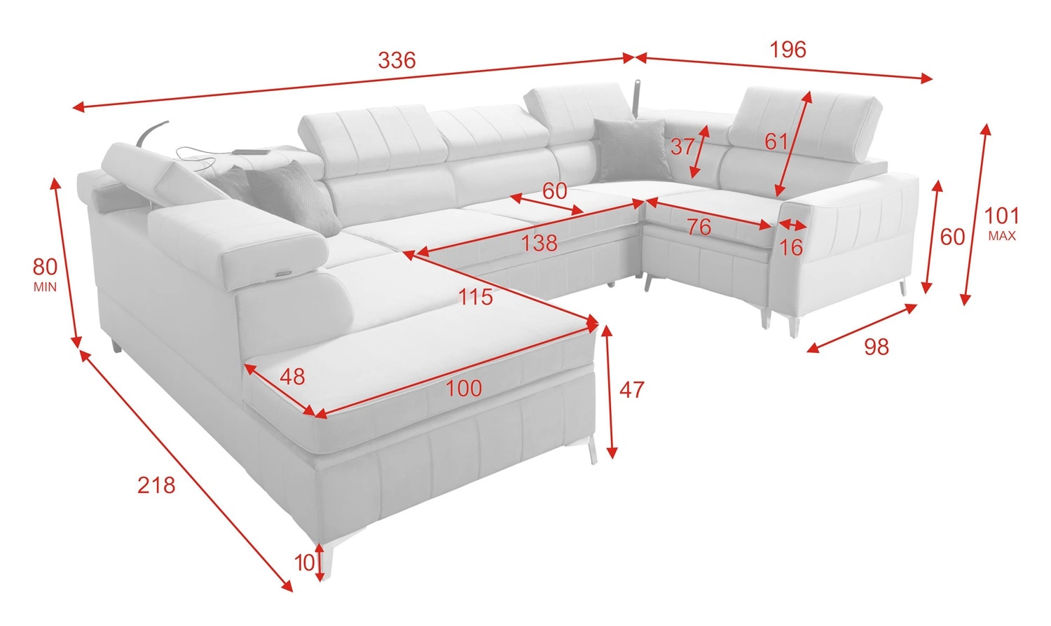 Wymiary mebla pozwolą na zapełnienie przestrzeni w przestronnym salonie lub pokoju dziennym. Szerokość narożnika 336 cm, wysokość maksymalna 101 cm oraz głębokość 196 cm. Powierzchnia spania narożnika wynosi 131x260 cm. Wysokość siedziska mebla to 47 cm a maksymalna wysokość oparcia wynosi 61 cm. Sprężyny faliste oraz pianka poliuretanowa T30 to materiał, z którego wykonane zostało siedzisko narożnika. Oparcie stałe z regulowanymi zagłówkami pozwoli na łatwe dostosowanie kąta nachylenia zagłówków do swoich preferencji oraz daje gwarancję wygodnego wypoczynku po długim dniu, które docenisz Ty, Twoi bliscy a także goście, którzy zasiądą na tym wyjątkowym narożniku.