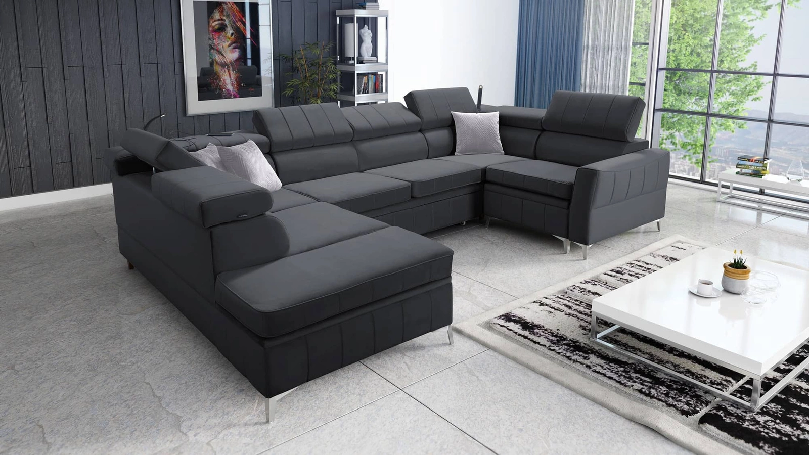 Narożnik Rava V w kolorze grafitowym z regulowanymi zagłówkami to elegancki mebel, który dopasuje się do każdej aranżacji.