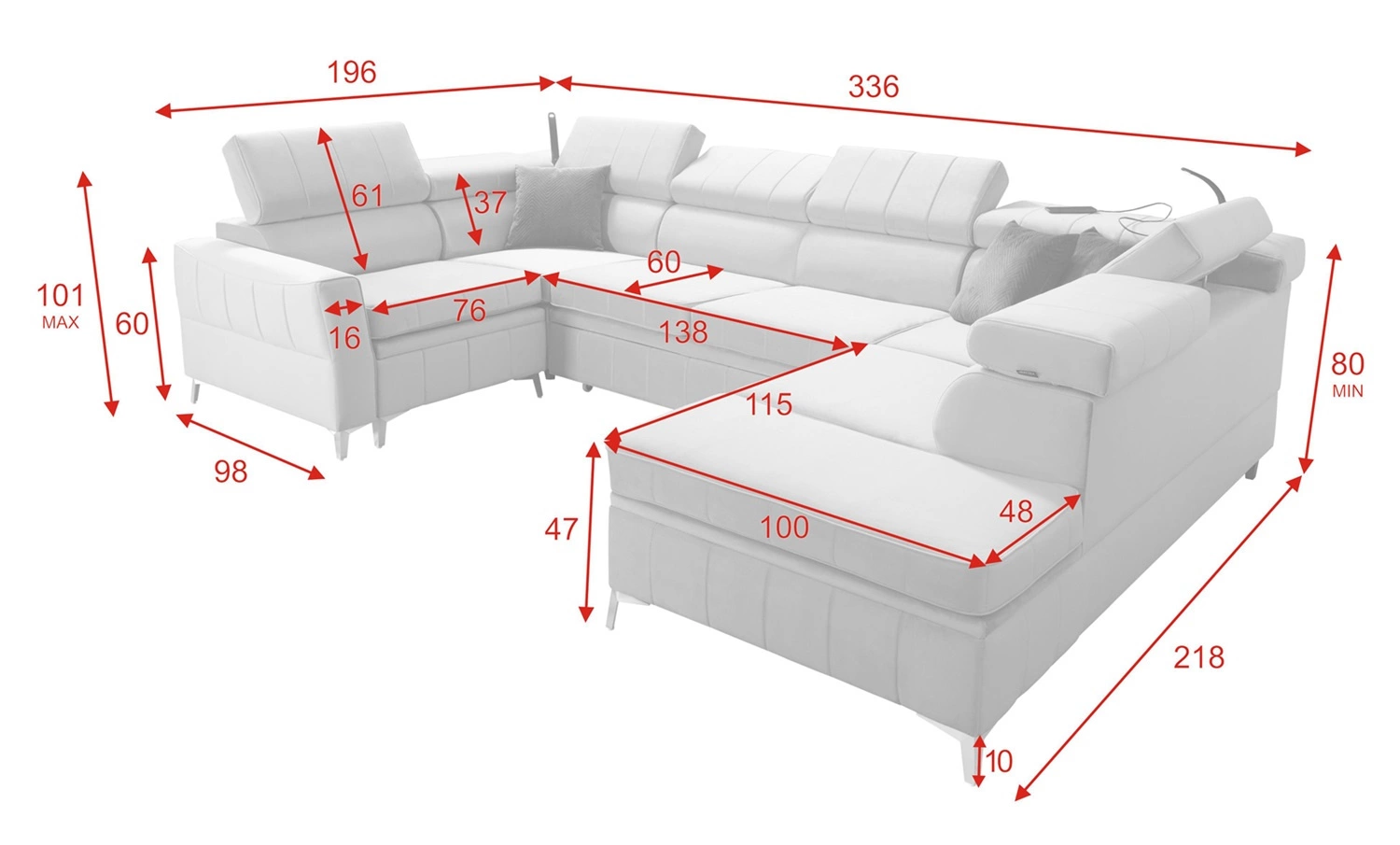Wymiary mebla pozwolą na zapełnienie przestrzeni w przestronnym salonie lub pokoju dziennym. Szerokość narożnika 336 cm, wysokość maksymalna 101 cm oraz głębokość 196 cm. Powierzchnia spania narożnika wynosi 131x260 cm. Wysokość siedziska mebla to 47 cm a maksymalna wysokość oparcia wynosi 61 cm. Sprężyny faliste oraz pianka poliuretanowa T30 to materiał, z którego wykonane zostało siedzisko narożnika. Oparcie stałe z regulowanymi zagłówkami pozwoli na łatwe dostosowanie kąta nachylenia zagłówków do swoich preferencji oraz daje gwarancję wygodnego wypoczynku po długim dniu, które docenisz Ty, Twoi bliscy a także goście, którzy zasiądą na tym wyjątkowym narożniku.