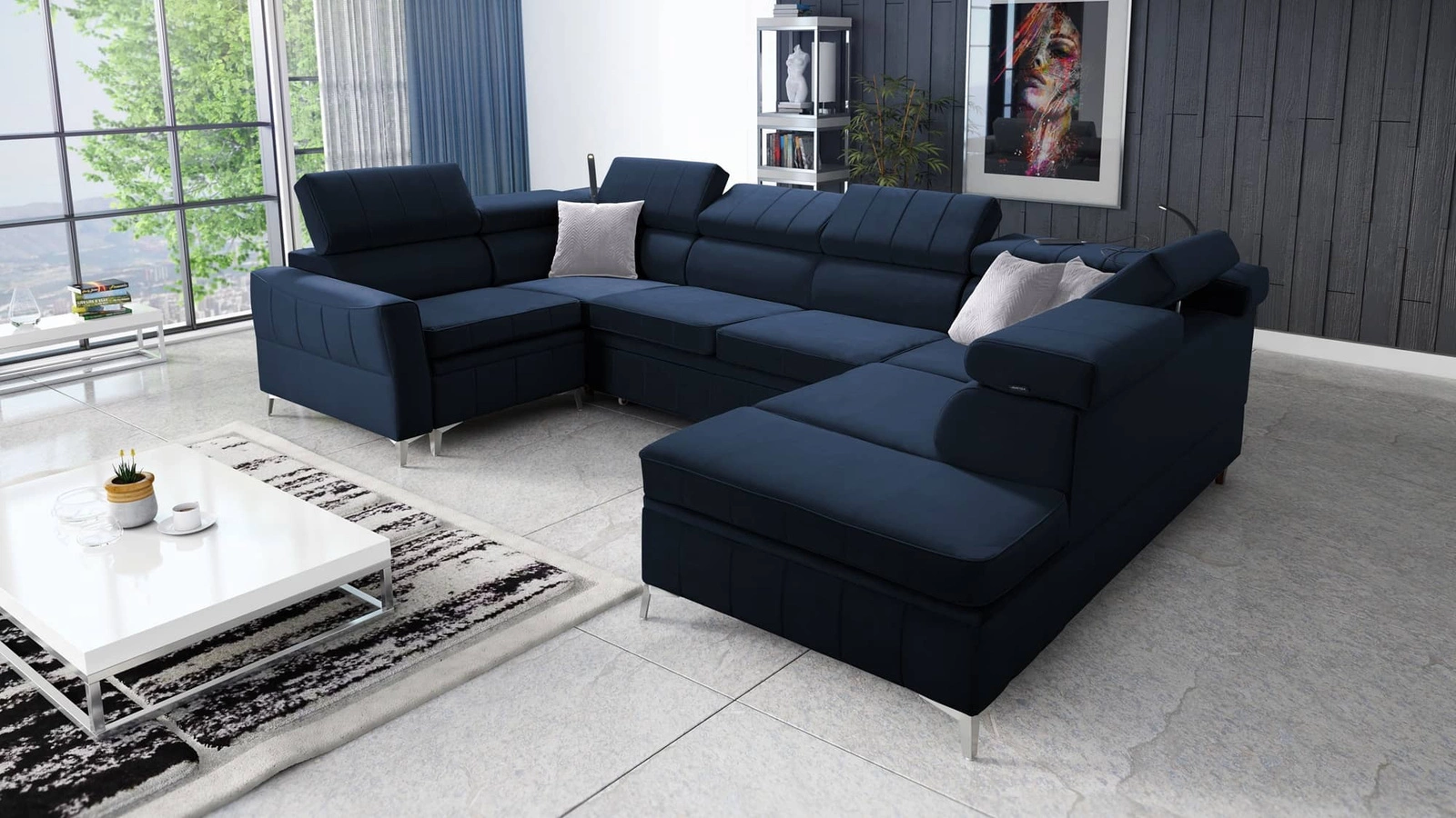 Narożnik Rava V w kolorze granatowym z regulowanymi zagłówkami to elegancki mebel, który dopasuje się do każdej aranżacji.