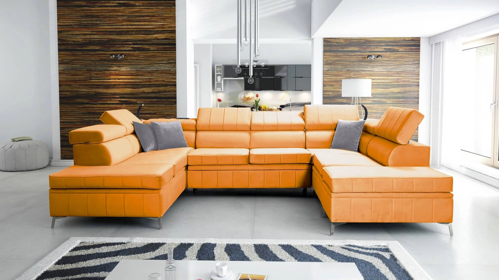 Narożnik Rava VIII w kolorze żółtym z regulowanymi zagłówkami to elegancki mebel, który dopasuje się do każdej aranżacji.
