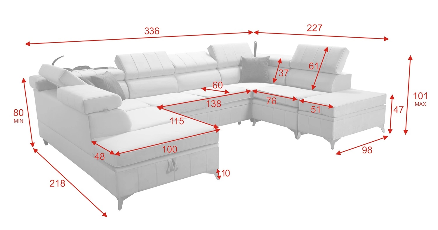 Wymiary mebla pozwolą na zapełnienie przestrzeni w przestronnym salonie lub pokoju dziennym. Szerokość narożnika 336 cm, wysokość maksymalna 101 cm oraz głębokość 227 cm. Powierzchnia spania narożnika wynosi 131x260 cm. Wysokość siedziska mebla to 47 cm a maksymalna wysokość oparcia wynosi 61 cm. Sprężyny faliste oraz pianka poliuretanowa T30 to materiał, z którego wykonane zostało siedzisko narożnika. Oparcie stałe z regulowanymi zagłówkami pozwoli na łatwe dostosowanie kąta nachylenia zagłówków do swoich preferencji oraz daje gwarancję wygodnego wypoczynku po długim dniu, które docenisz Ty, Twoi bliscy a także goście, którzy zasiądą na tym wyjątkowym narożniku.