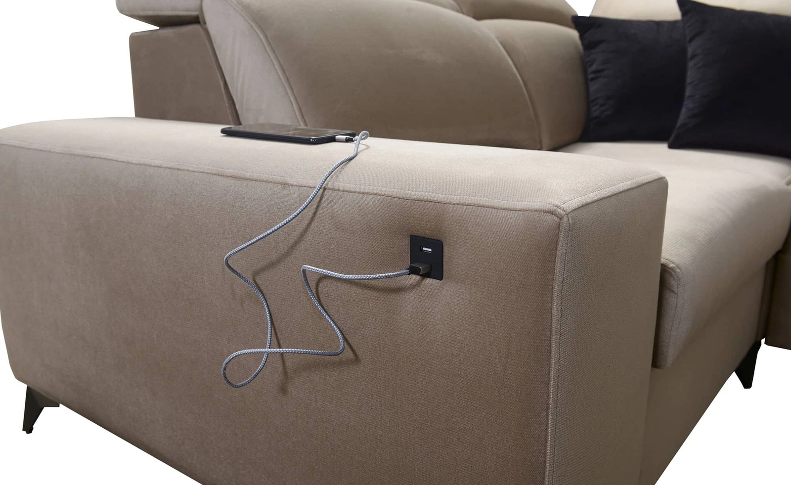 Dodatki tego mebla, które docenią wszyscy użytkownicy to pojemnik na pościel, funkcja spania, gniazdo USB w boczku narożnika do ładowania telefonu i innych urządzeń multimedialnych.