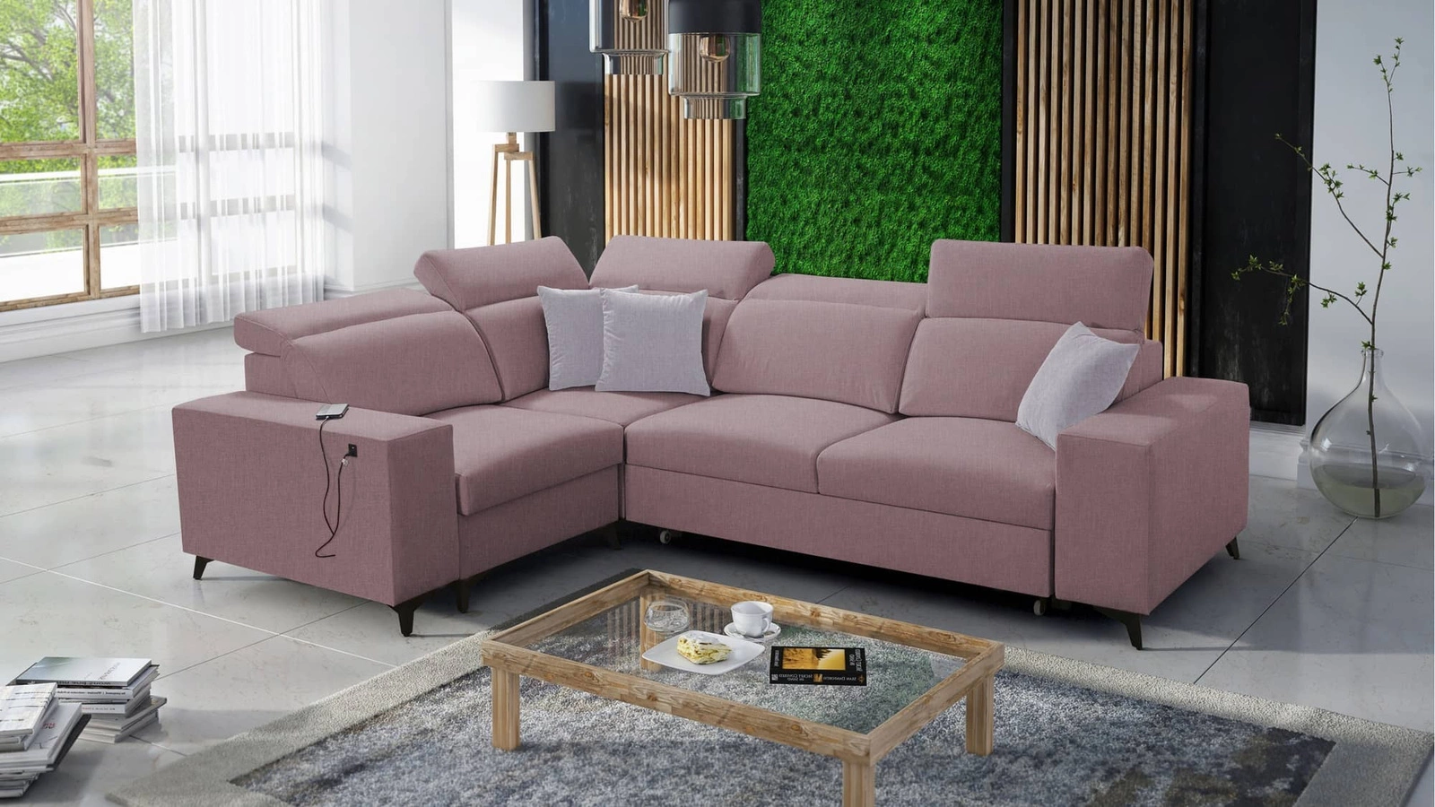 Narożnik Kelly Sleek II w kolorze lawendowy róż z regulowanymi zagłówkami to przepis na nowoczesne wnętrze w Twoim domu!