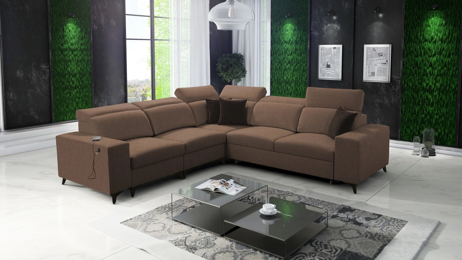 Narożnik Kelly Sleek III w kolorze jasny brązowy z regulowanymi zagłówkami to przepis na nowoczesne wnętrze w Twoim domu!