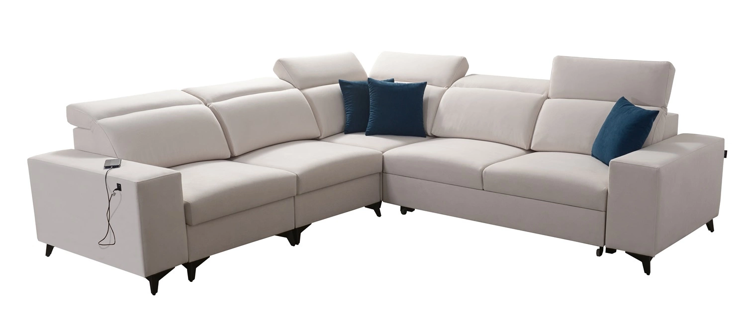 Dodatki tego mebla, które docenią wszyscy użytkownicy to pojemniki na pościel, funkcja spania, gniazdo USB w boczku narożnika do ładowania telefonu i innych urządzeń multimedialnych.