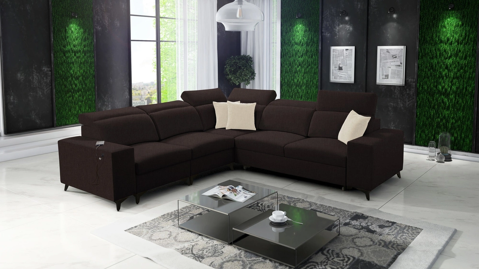 Narożnik Kelly Sleek III w kolorze brązowym z regulowanymi zagłówkami to przepis na nowoczesne wnętrze w Twoim domu!