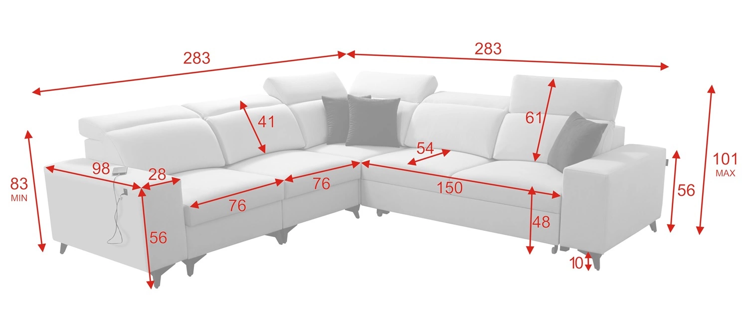 Wymiary mebla pozwolą na zapełnienie przestrzeni w przestronnym salonie lub pokoju dziennym. Szerokość narożnika 283 cm, wysokość maksymalna 101 cm oraz głębokość 283 cm. Powierzchnia spania narożnika wynosi 122x202 cm. Wysokość siedziska mebla to 48 cm a maksymalna wysokość oparcia wynosi 61 cm. Sprężyny faliste oraz pianka poliuretanowa T30 to materiał, z którego wykonane zostało siedzisko narożnika. Oparcie stałe z regulowanymi zagłówkami daje gwarancję wygodnego wypoczynku po długim dniu, które docenisz Ty, Twoi bliscy a także goście, którzy zasiądą na tym wyjątkowym narożniku.