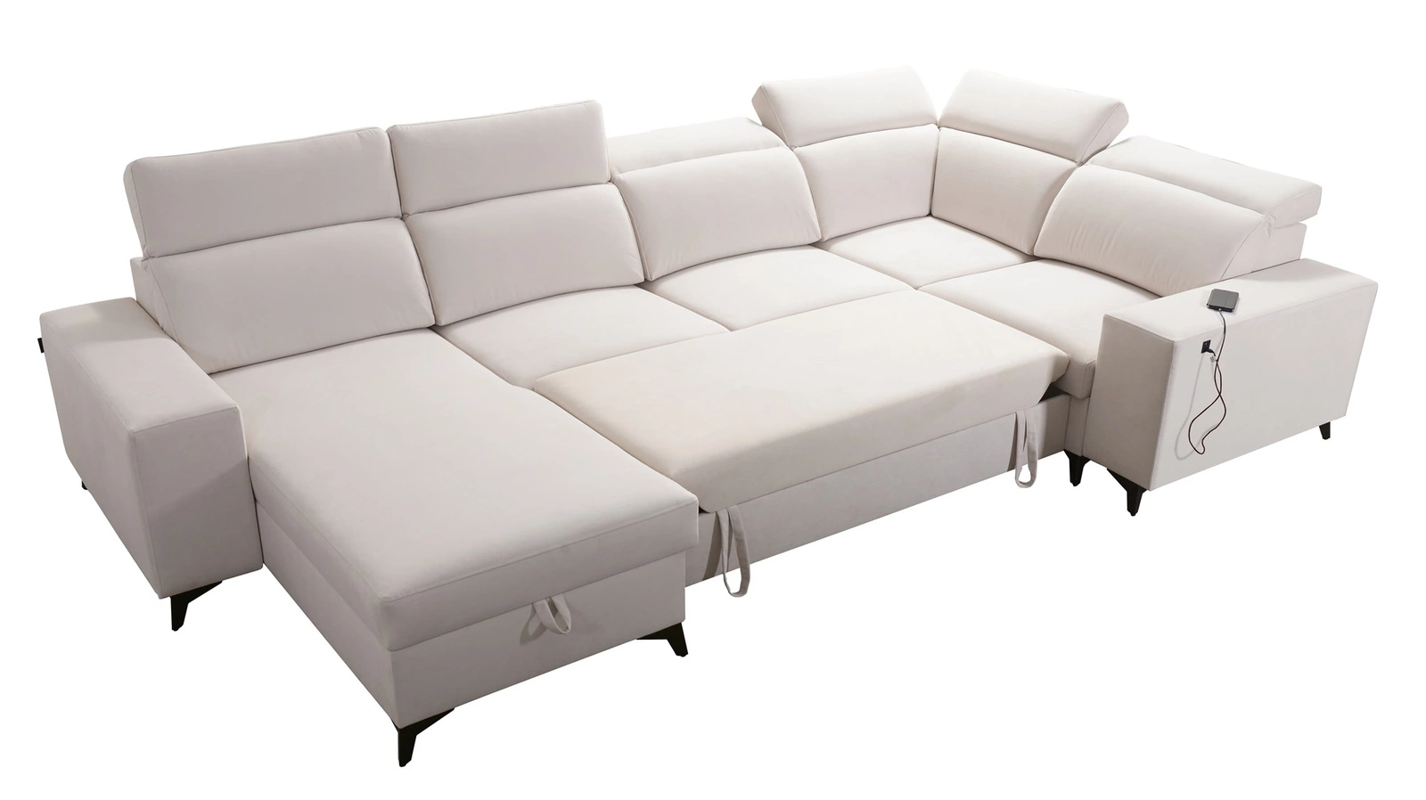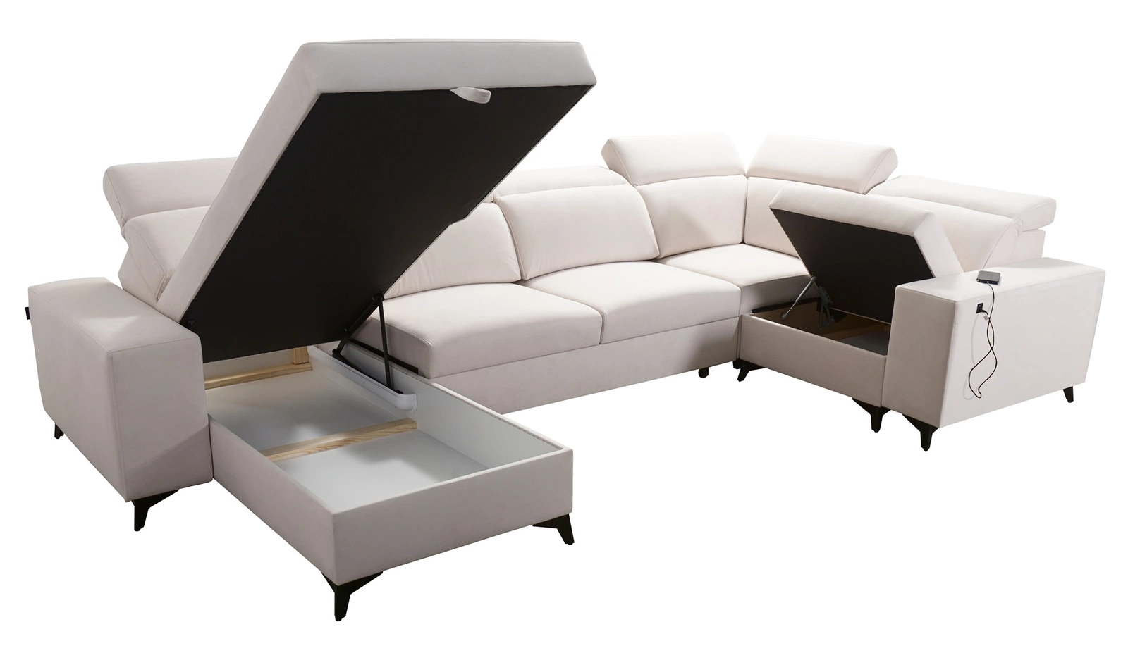 Dodatki tego mebla, które docenią wszyscy użytkownicy to pojemniki na pościel, funkcja spania, gniazdo USB w boczku narożnika do ładowania telefonu i innych urządzeń multimedialnych.