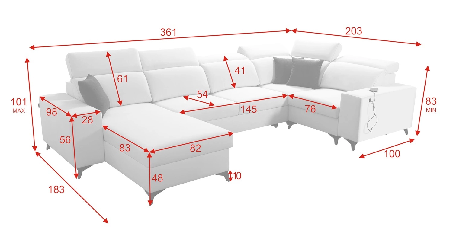 Wymiary mebla pozwolą na zapełnienie przestrzeni w przestronnym salonie lub pokoju dziennym. Szerokość narożnika 361 cm, wysokość maksymalna 101 cm oraz głębokość 203 cm. Powierzchnia spania narożnika wynosi 122x283 cm. Wysokość siedziska mebla to 48 cm a maksymalna wysokość oparcia wynosi 61 cm. Sprężyny faliste oraz pianka poliuretanowa T30 to materiał, z którego wykonane zostało siedzisko narożnika. Oparcie stałe z regulowanymi zagłówkami daje gwarancję wygodnego wypoczynku po długim dniu, które docenisz Ty, Twoi bliscy a także goście, którzy zasiądą na tym wyjątkowym narożniku.