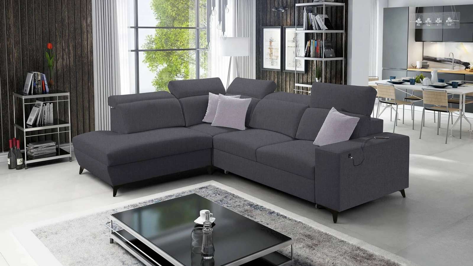 Narożnik Kelly Sleek VII w kolorze grafitowym z regulowanymi zagłówkami to przepis na nowoczesne wnętrze w Twoim domu!