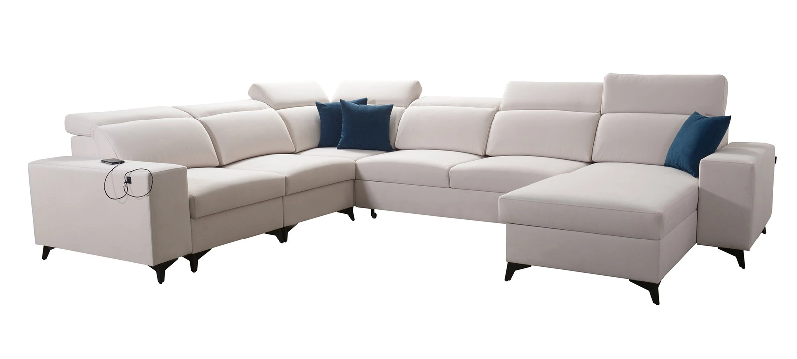 Dodatki tego mebla, które docenią wszyscy użytkownicy to pojemniki na pościel, funkcja spania, gniazdo USB w boczku narożnika do ładowania telefonu i innych urządzeń multimedialnych.