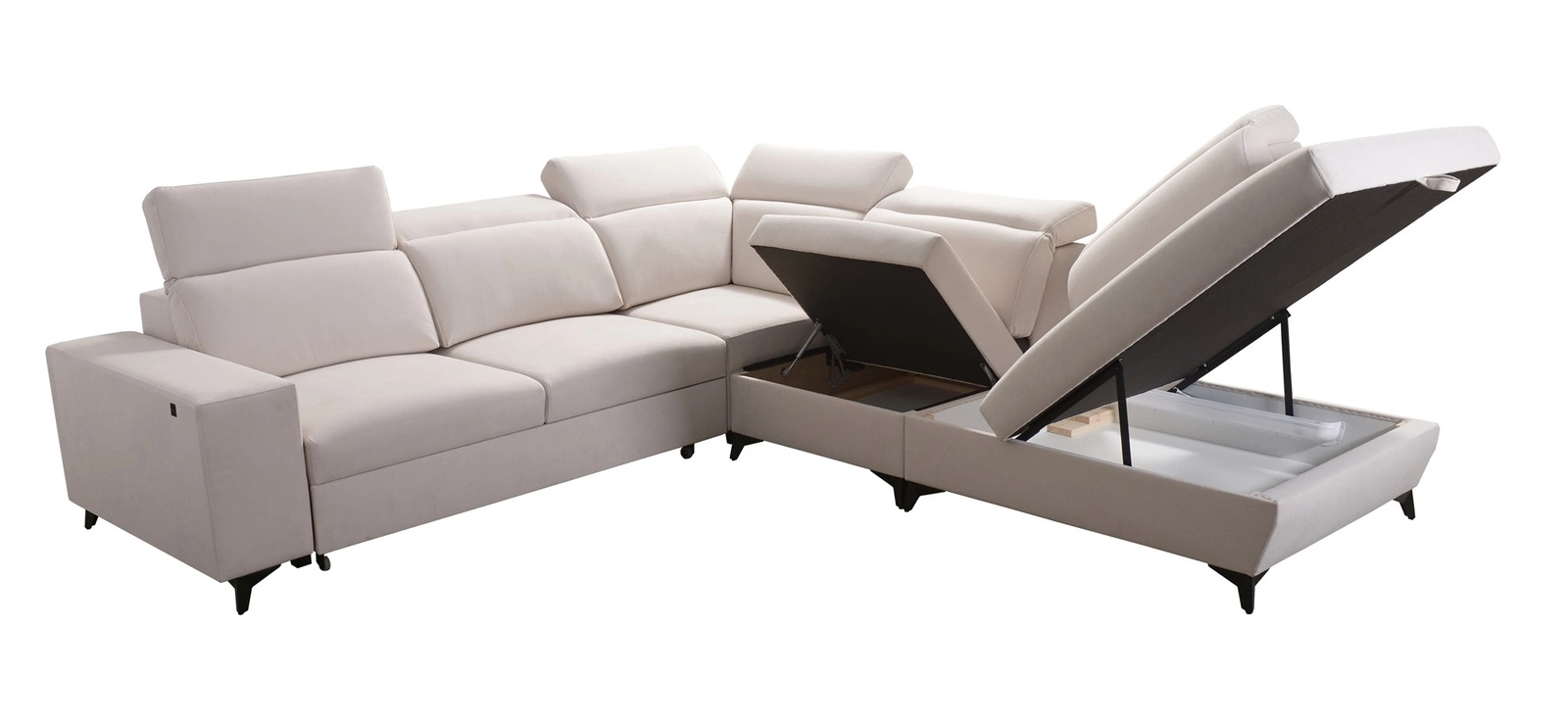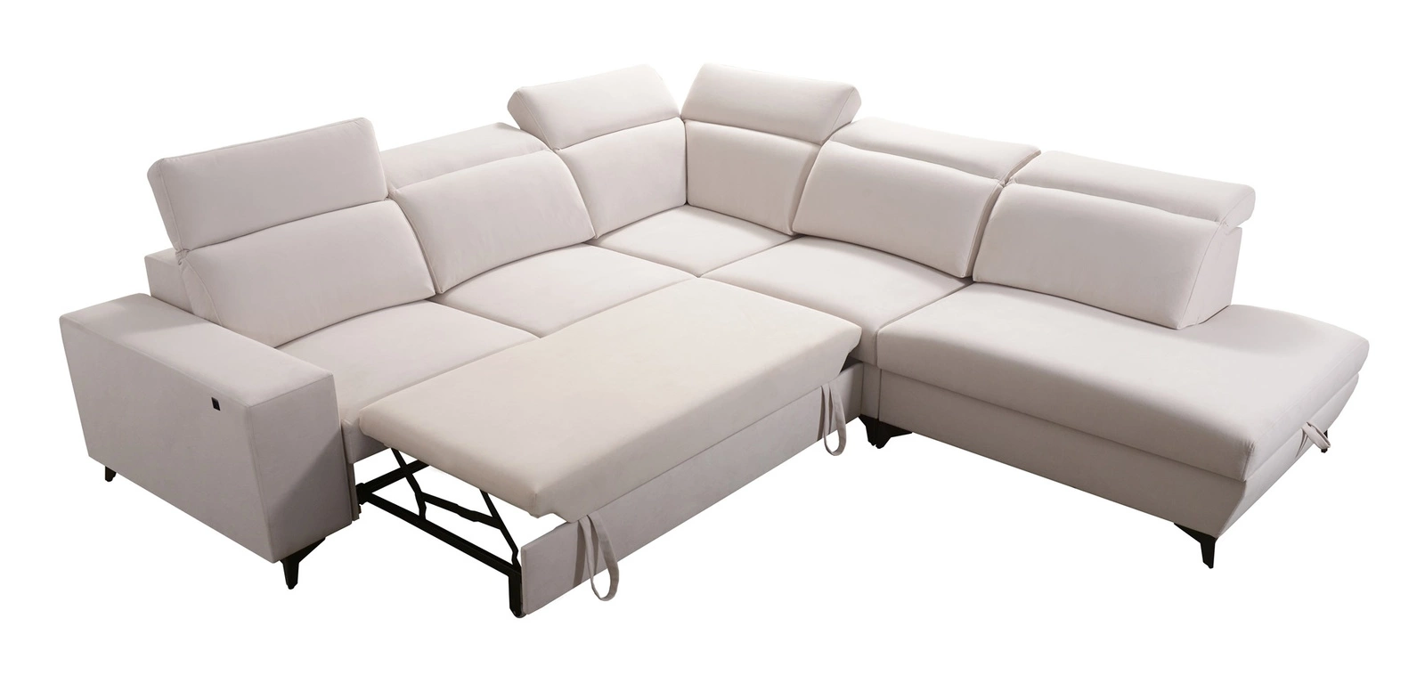 Dodatki tego mebla, które docenią wszyscy użytkownicy to pojemniki na pościel, funkcja spania, gniazdo USB w boczku narożnika do ładowania telefonu i innych urządzeń multimedialnych.