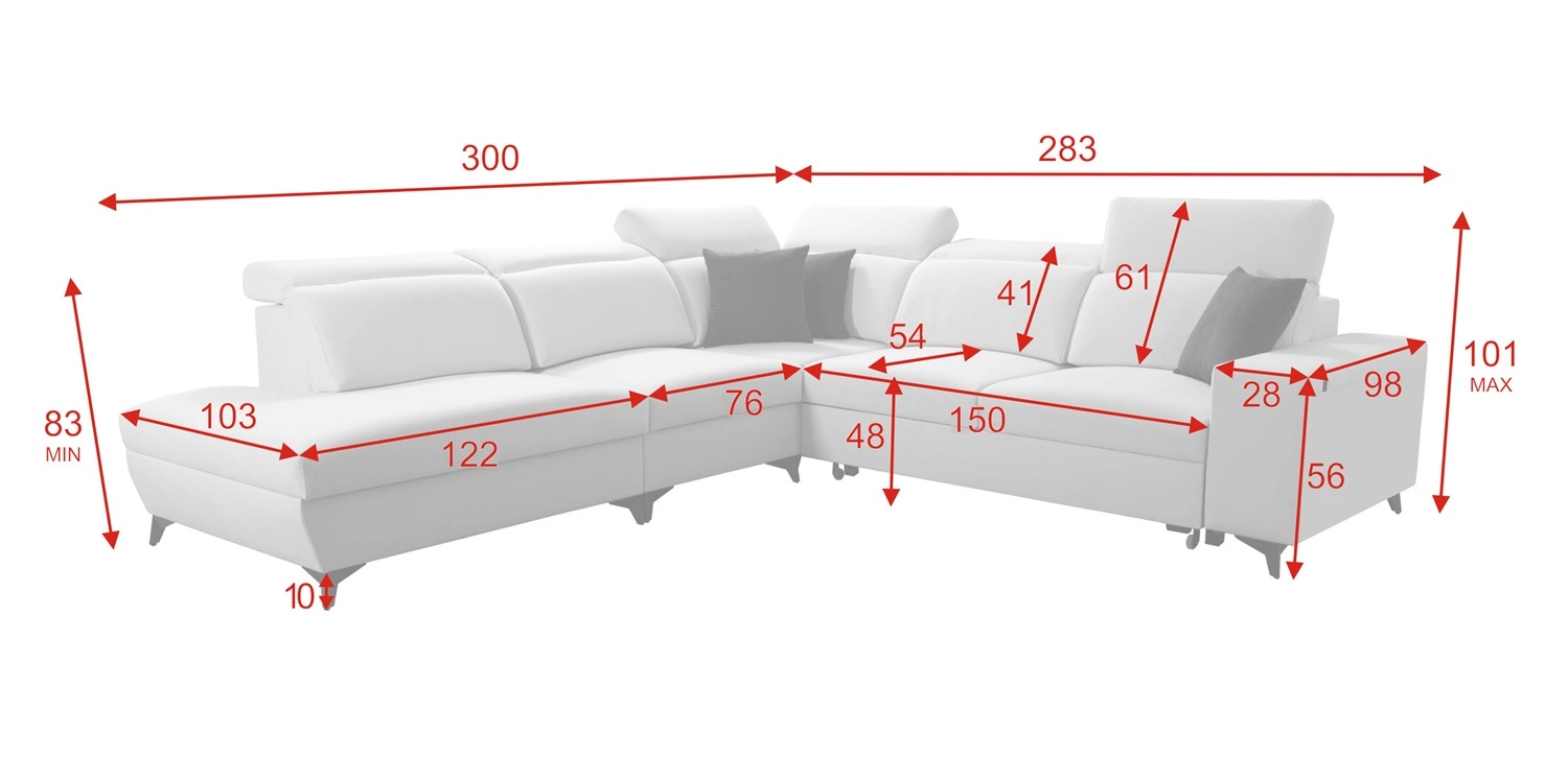 Wymiary mebla pozwolą na zapełnienie przestrzeni w przestronnym salonie lub pokoju dziennym. Szerokość narożnika 283 cm, wysokość maksymalna 101 cm oraz głębokość 300 cm. Powierzchnia spania narożnika wynosi 122x202 cm. Wysokość siedziska mebla to 48 cm a maksymalna wysokość oparcia wynosi 61 cm. Sprężyny faliste oraz pianka poliuretanowa T30 to materiał, z którego wykonane zostało siedzisko narożnika. Oparcie stałe z regulowanymi zagłówkami daje gwarancję wygodnego wypoczynku po długim dniu, które docenisz Ty, Twoi bliscy a także goście, którzy zasiądą na tym wyjątkowym narożniku.