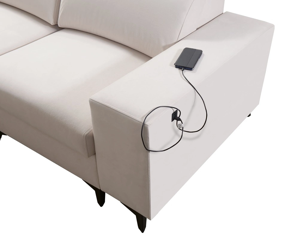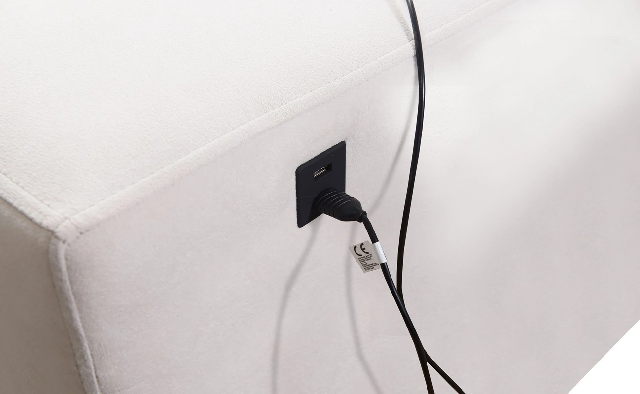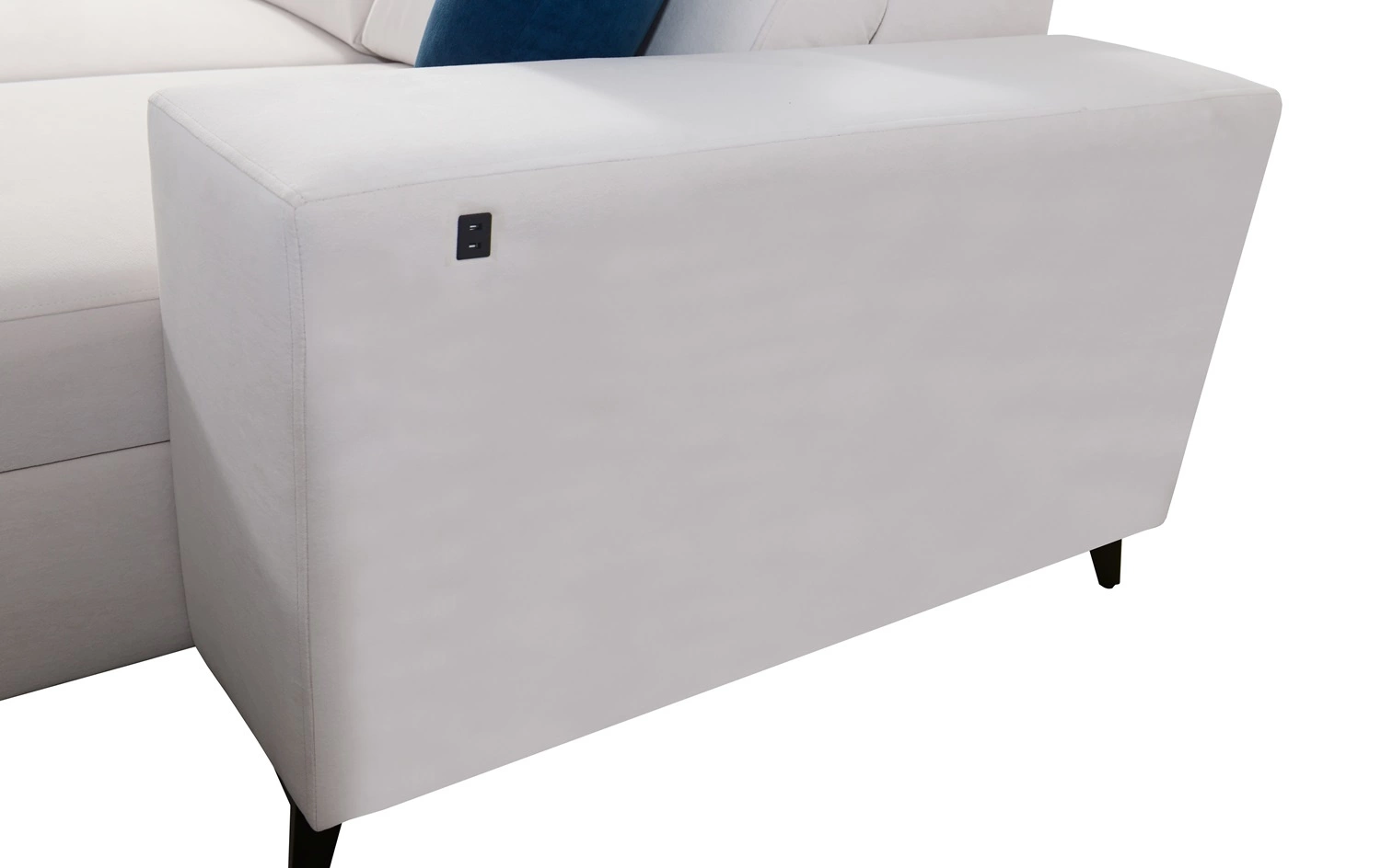 Dodatki tego mebla, które docenią wszyscy użytkownicy to pojemniki na pościel, funkcja spania, gniazdo USB w boczku narożnika do ładowania telefonu i innych urządzeń multimedialnych.