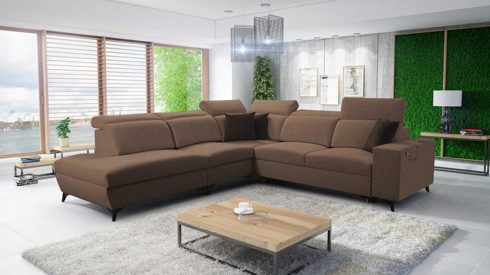 Narożnik Kelly Sleek IX w kolorze jasny brązowy z regulowanymi zagłówkami to przepis na nowoczesne wnętrze w Twoim domu!