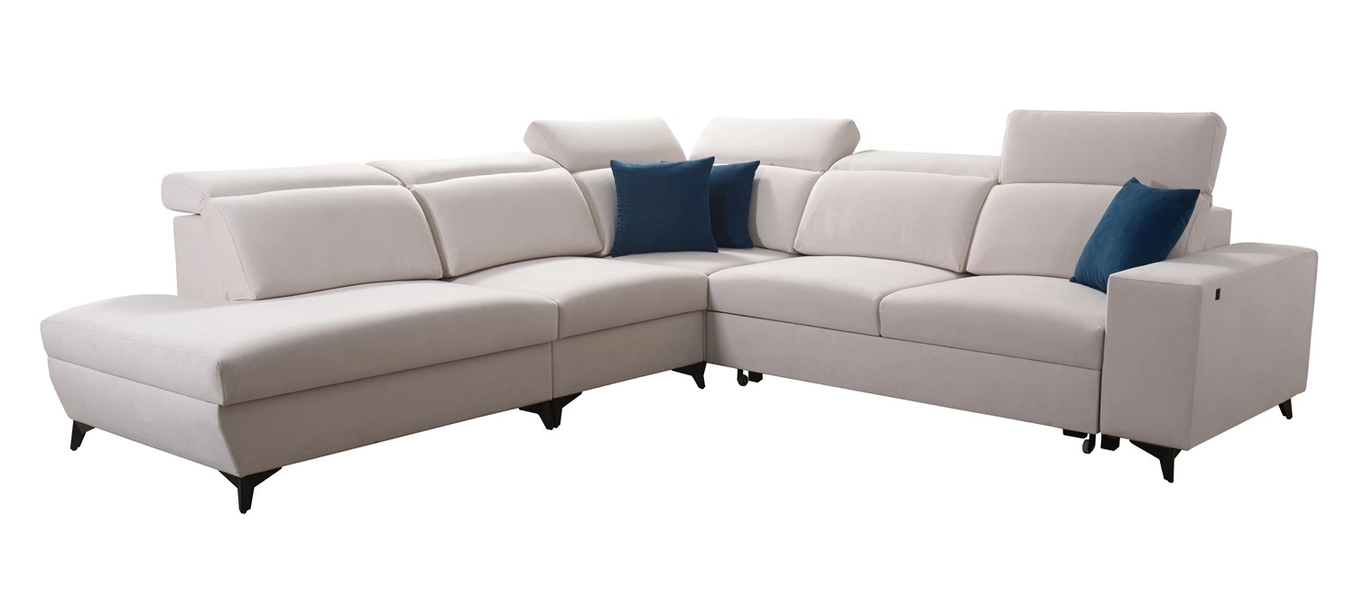 Dodatki tego mebla, które docenią wszyscy użytkownicy to pojemniki na pościel, funkcja spania, gniazdo USB w boczku narożnika do ładowania telefonu i innych urządzeń multimedialnych.