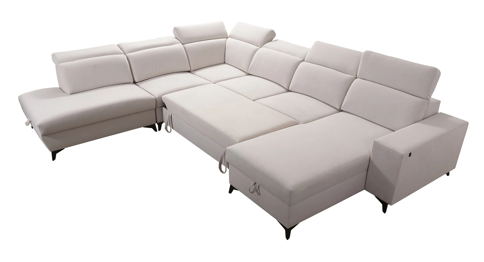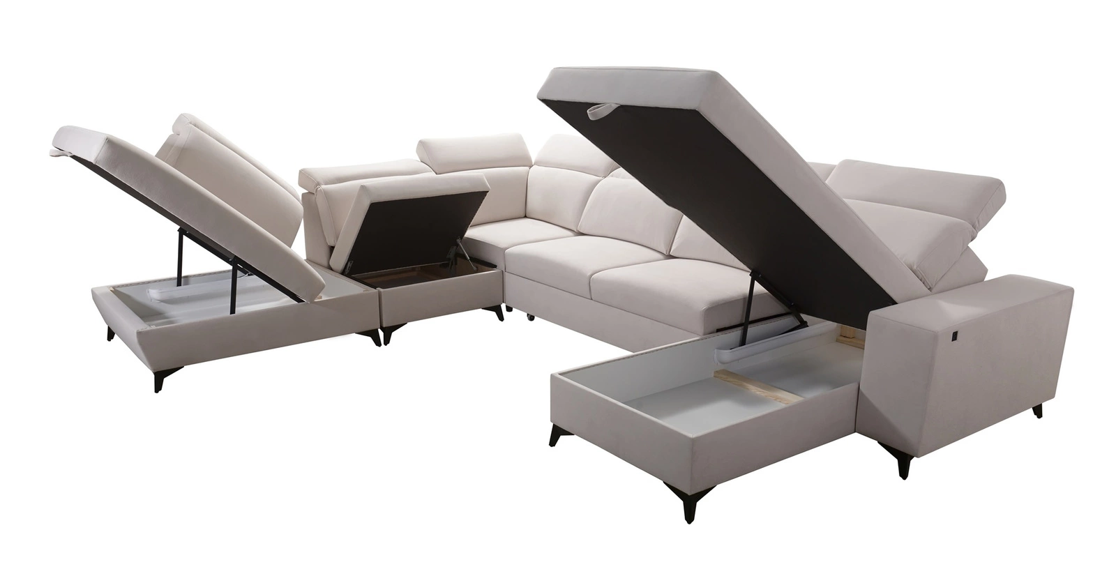Dodatki tego mebla, które docenią wszyscy użytkownicy to pojemniki na pościel, funkcja spania, gniazdo USB w boczku narożnika do ładowania telefonu i innych urządzeń multimedialnych.