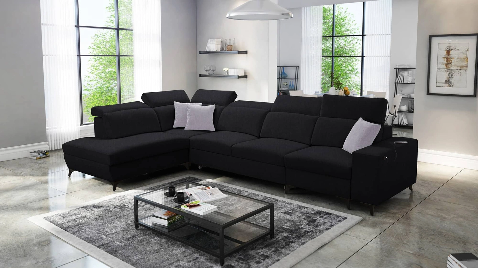 Narożnik Kelly Sleek XI w kolorze czarnym z regulowanymi zagłówkami to przepis na nowoczesne wnętrze w Twoim domu!