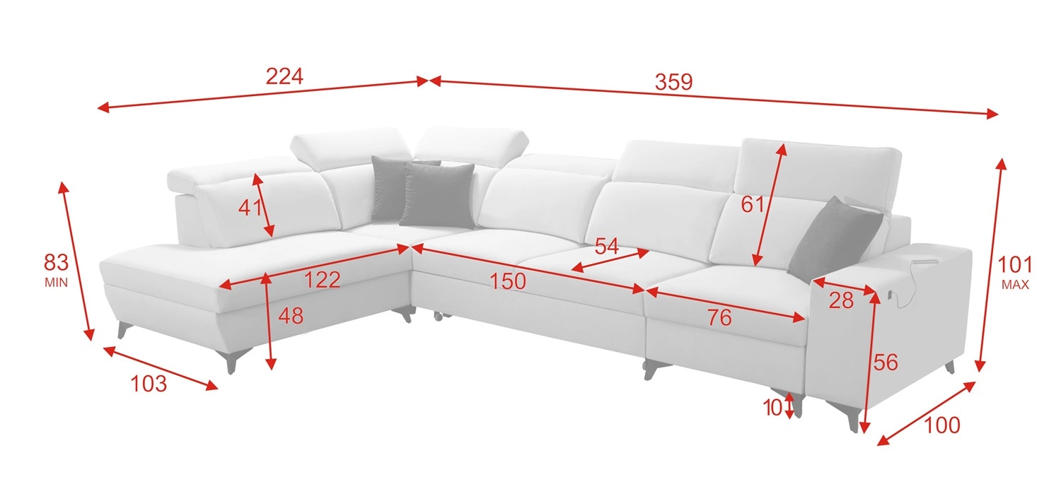 Wymiary mebla pozwolą na zapełnienie przestrzeni w przestronnym salonie lub pokoju dziennym. Szerokość narożnika 359 cm, wysokość maksymalna 101 cm oraz głębokość 224 cm. Powierzchnia spania narożnika wynosi 122x202 cm. Wysokość siedziska mebla to 48 cm a maksymalna wysokość oparcia wynosi 61 cm. Sprężyny faliste oraz pianka poliuretanowa T30 to materiał, z którego wykonane zostało siedzisko narożnika. Oparcie stałe z regulowanymi zagłówkami daje gwarancję wygodnego wypoczynku po długim dniu, które docenisz Ty, Twoi bliscy a także goście, którzy zasiądą na tym wyjątkowym narożniku.