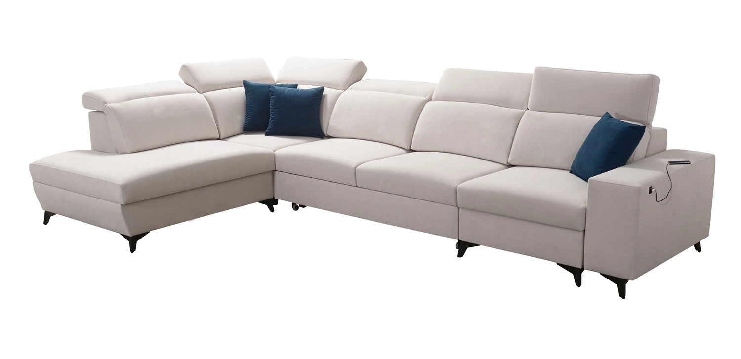 Dodatki tego mebla, które docenią wszyscy użytkownicy to pojemniki na pościel, funkcja spania, gniazdo USB w boczku narożnika do ładowania telefonu i innych urządzeń multimedialnych.