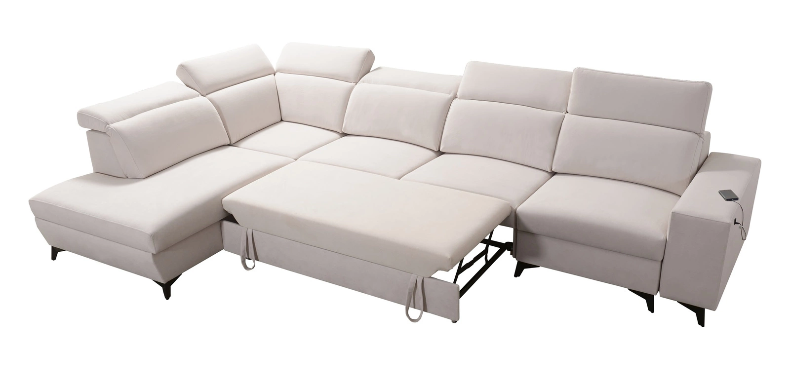 Dodatki tego mebla, które docenią wszyscy użytkownicy to pojemniki na pościel, funkcja spania, gniazdo USB w boczku narożnika do ładowania telefonu i innych urządzeń multimedialnych.